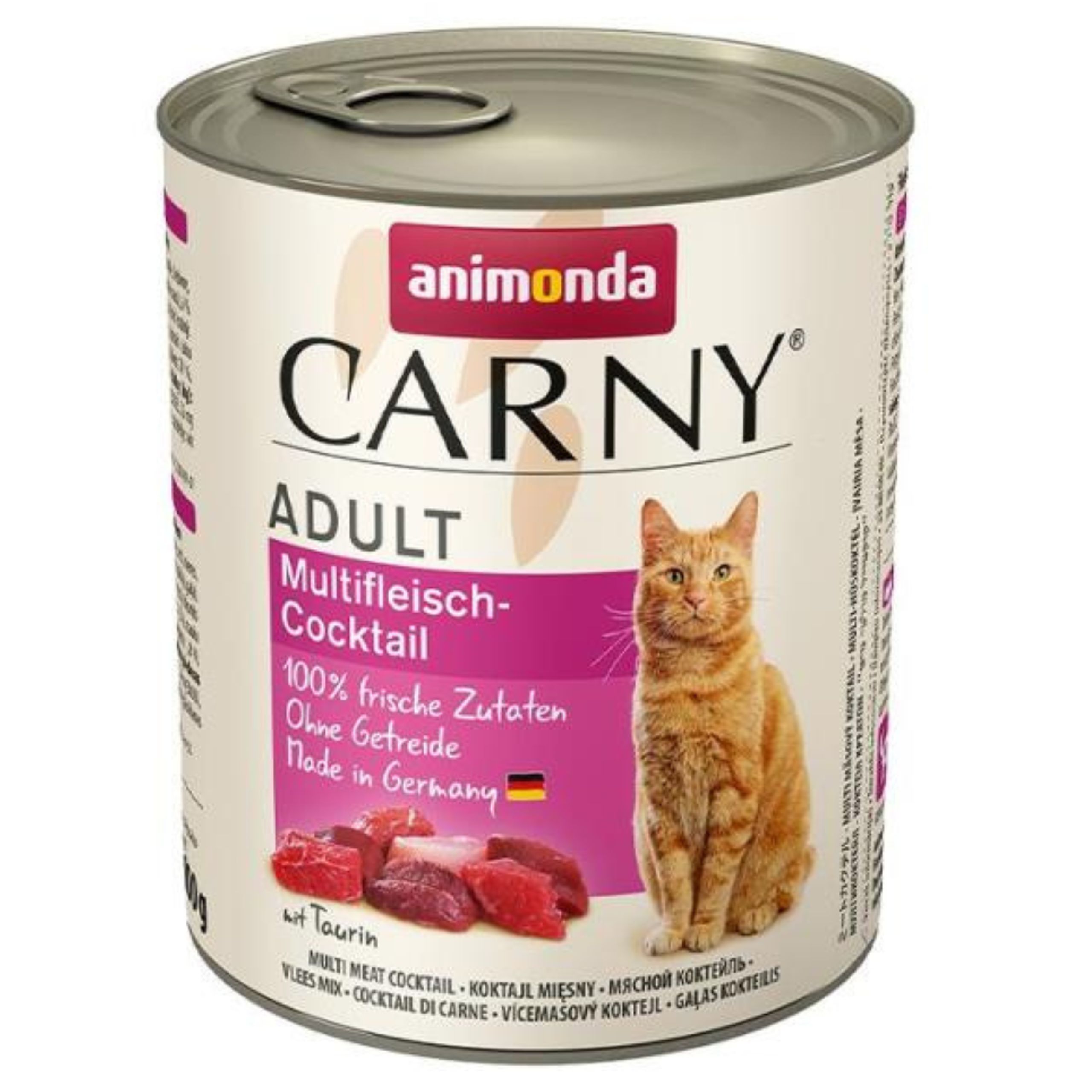 ANIMONDA Carny ADULT koktajl mięsny to wysokiej jakości pełnoporcjowa karma dla kotów wszystkich ras. Kompozycja wołowiny, kurczaka oraz dziczyzny dostarcza pełnowartościowego białka zwierzęcego, niezbędnego w diecie każdego mięsożercy. Co więcej, karma nie zawiera zbóż, soi, sztucznych konserwantów ani barwników, co czyni ją odpowiednią także dla kotów z alergiami na niektóre składniki. Dzięki wysokiej strawności jest idealna dla kotów wrażliwych, a jej pełnowartościowa formuła gwarantuje zdrową dietę każdego dnia.