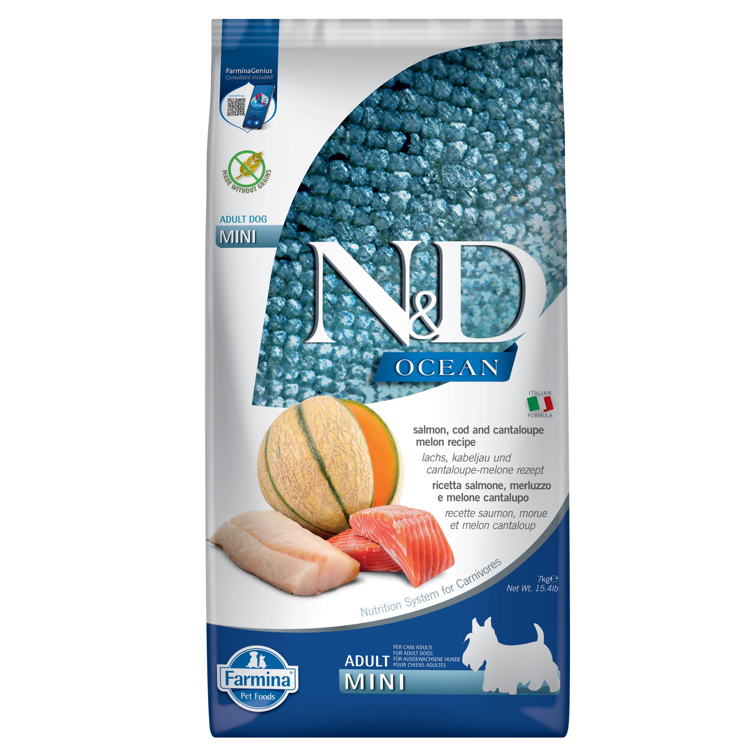 FARMINA N&D Ocean Adult Mini Salmon to wysokiej jakości karma z owocami morza, wspierająca zdrowie i dobrą kondycję psów ras miniaturowych.