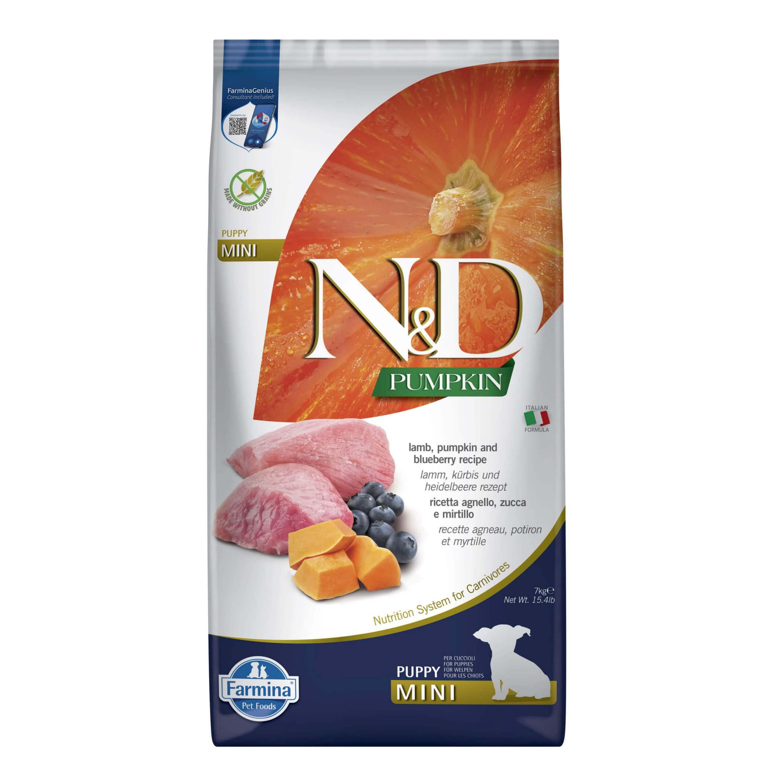 Pełnoporcjowa i bezzbożowa karma dla szczeniąt i ciężarnych lub karmiących suk, z wysokiej jakości mięsem z jagnięciny z ekologicznych hodowli i borówką amerykańską z dodatkiem dyni, funkcjonalnych warzyw i owoców oraz zawierająca wyciągi roślinne.