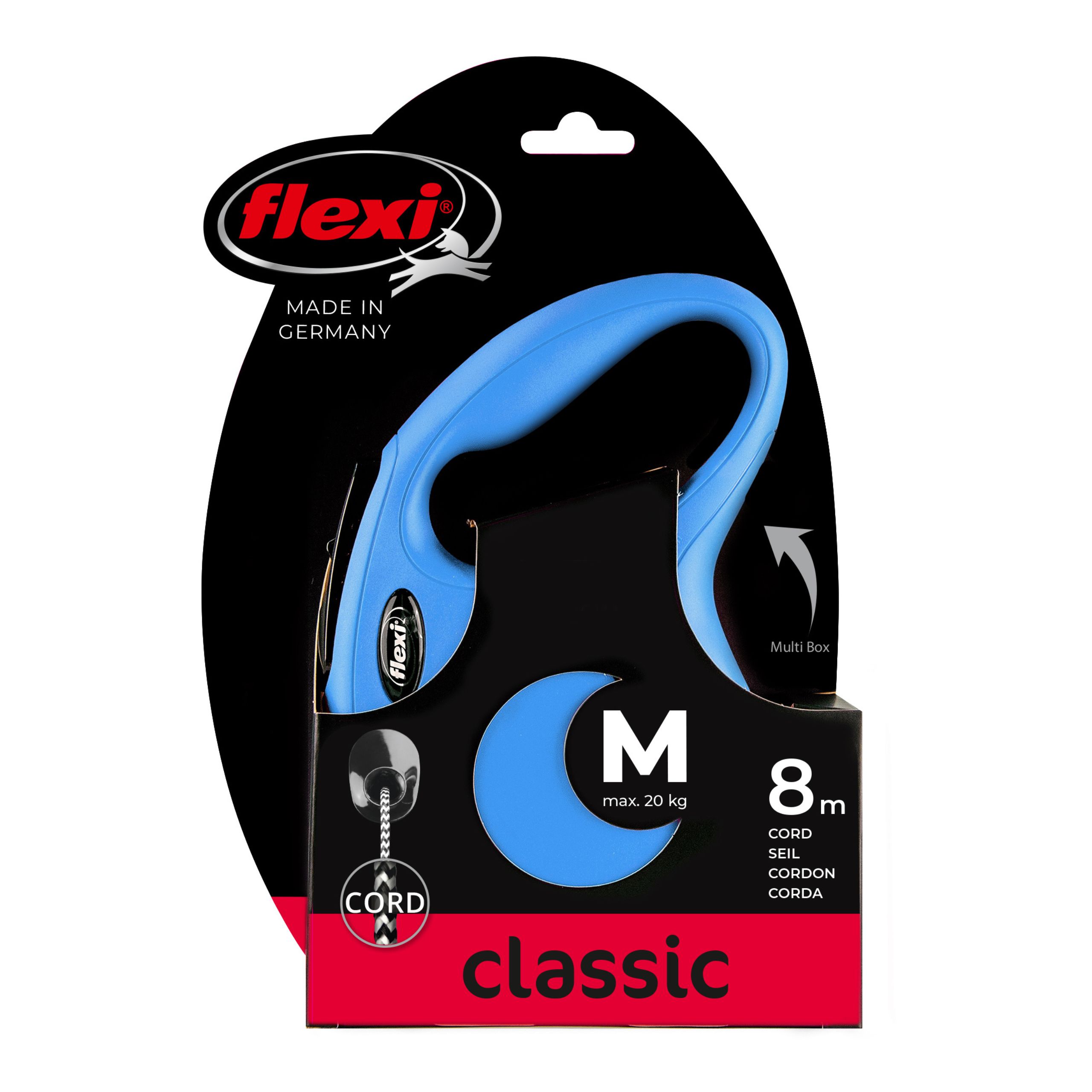 Smycz automatyczna dla psów ras średnich do 20 kg z linką o długości 8m – zwiększona długość. Smycz Flexi Classic posiada ulepszony system hamulcowy oraz możliwość zastosowania akcesoriów: Multibox oraz Led Lighting System