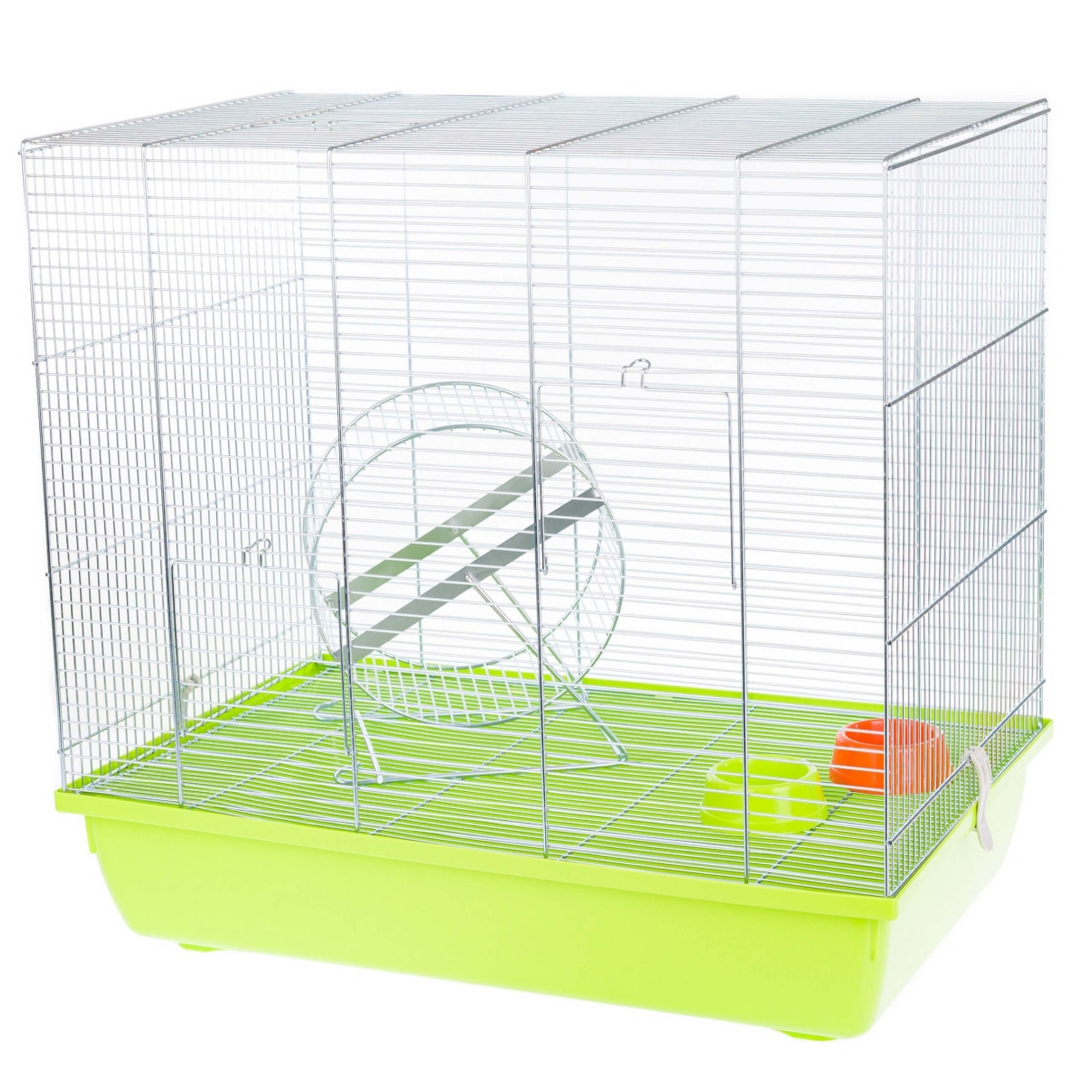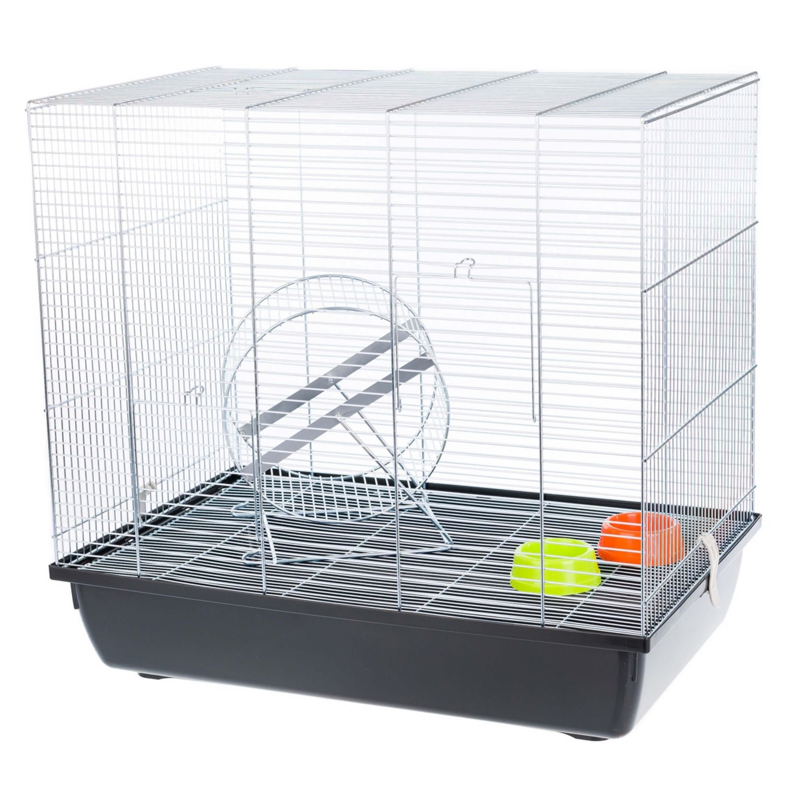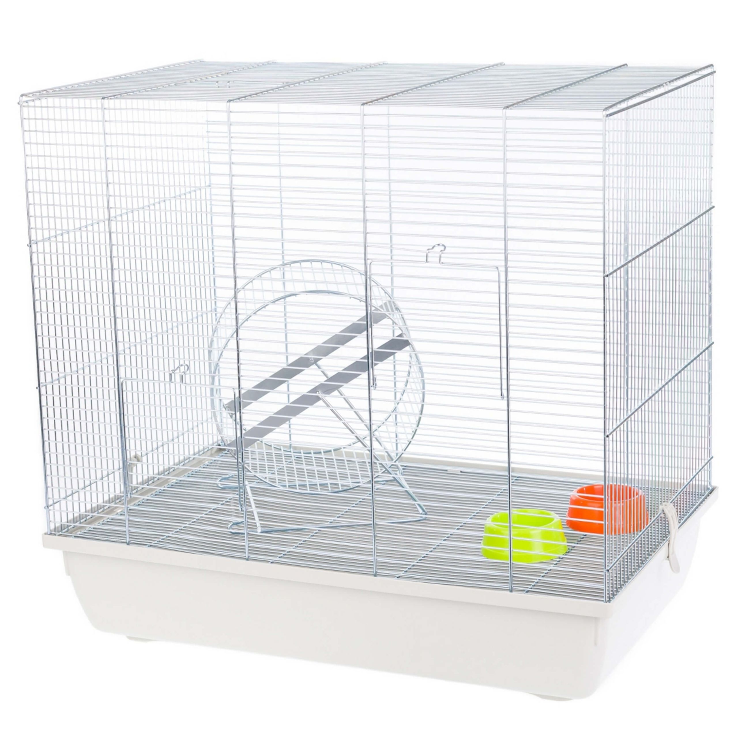 Klatka dla wiewiórkii z wyposażeniem widocznym na zdjęciu. Wykonana z ocynkowanego drutu (srebrzystego) odpornego na rdzewienie i podgryzanie. Posiada odczepianą kuwetę ułatwiającą czyszczenie.