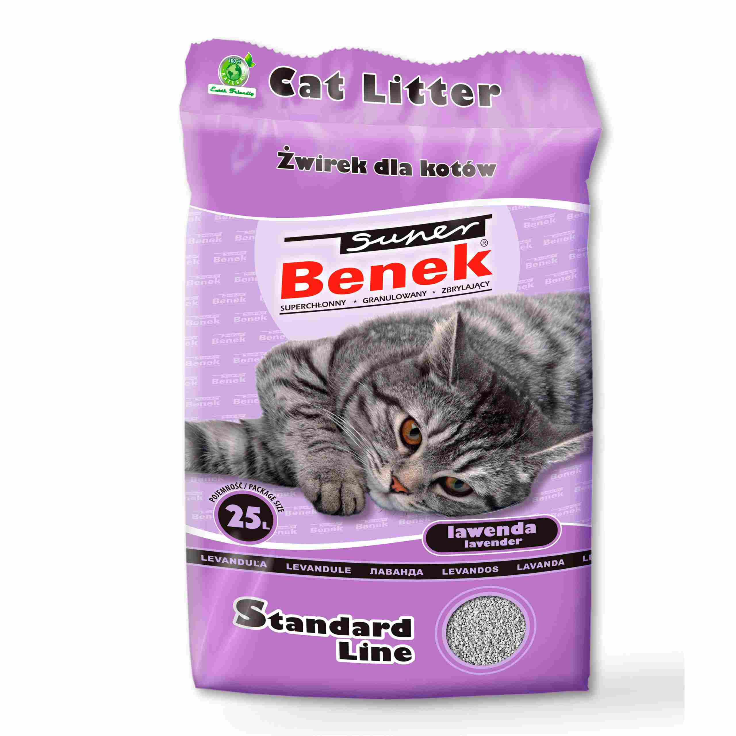 SUPER BENEK LAWENDA to żwirek w pełni przyjazny zwierzętom, bezpyłowy, doskonale pochłaniający zapachy i płyny, dzięki czemu kuweta Twojego kota będzie świeża i łatwa do utrzymania w czystości.